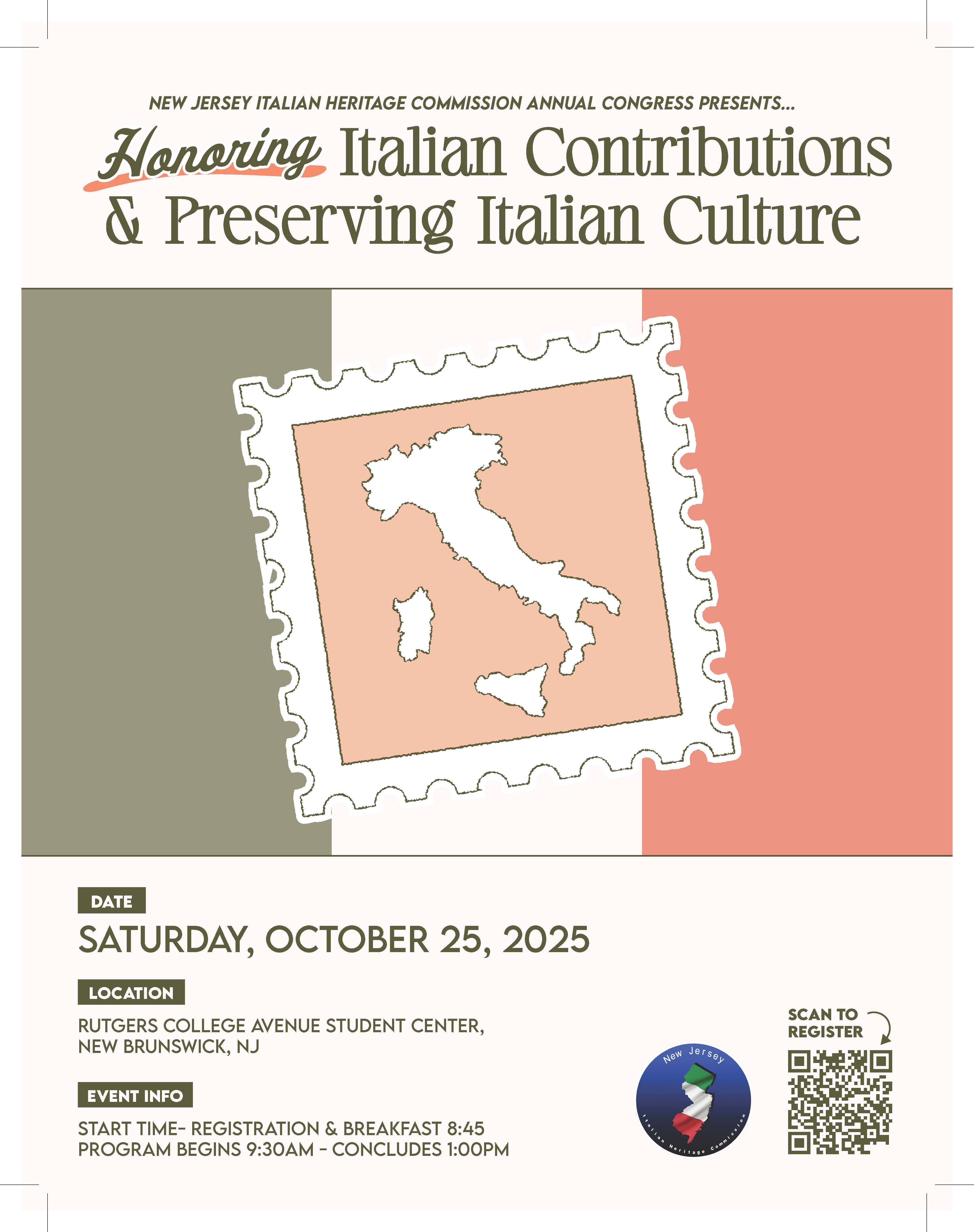 (New Brunswick, NJ – October 2025) – The New Jersey Italian Heritage Commission will host its Annual Congress on Saturday, October 25, 2025, at the Rutgers College Avenue Student Center in New Brunswick, NJ. The event, themed “Honoring Italian Contributions and Preserving Italian Culture,” will bring together educators, community leaders, and the public to highlight the rich heritage and ongoing contributions of the Italian American community.